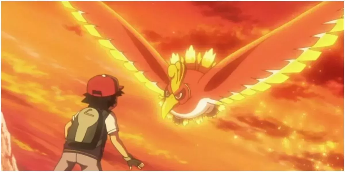 Ho-Oh es un Pokémon legendario de tipo Fuego/Volador con amplias alas rojas, plumaje naranja en la cola y plumas enroscadas en la coronilla. Es un pájaro regio que Ash vio en el primer episodio, "Pokémon: ¡Te elijo a ti!" El avistamiento fue tan extraño y fugaz que podría habérselo imaginado, y parecía insinuar que grandes cosas estaban por llegar ahora que empezaba su viaje como Entrenador Pokémon.