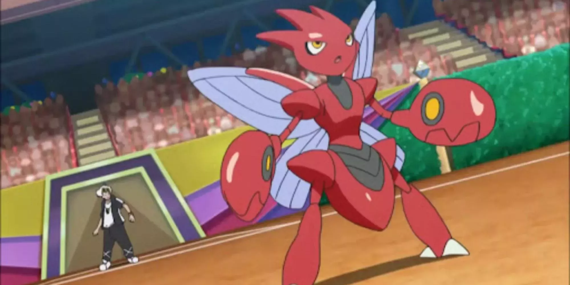Gary presenta su poder en su combate de la Conferencia de Plata contra Ash, ya que derrota a Snorlax y Muk antes de perder contra Charizard. En la Conferencia Ever Grande de Hoenn, el Scizor de Katie pierde ante Swellow sin conseguir ninguna victoria. En la Conferencia de Manalo, en Alola, Scizor es utilizado por el Líder Guzma del Equipo Skull y se muestra como un batallador implacable hasta que finalmente cae ante el Torracat de Ash.