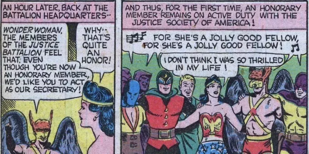 La Mujer Maravilla es un icono ahora, pero en el pasado le costó ganarse el respeto de sus colegas. Cuando se unió por primera vez a la Sociedad de la Justicia de América (un superequipo que precedió a la Liga de la Justicia), el grupo, formado exclusivamente por hombres, la nombró miembro honorario. Lo hicieron pidiéndole que se convirtiera en su secretaria, a pesar de ser uno de los personajes más fuertes de DC en ese momento. Lo peor es que aceptó la oferta.