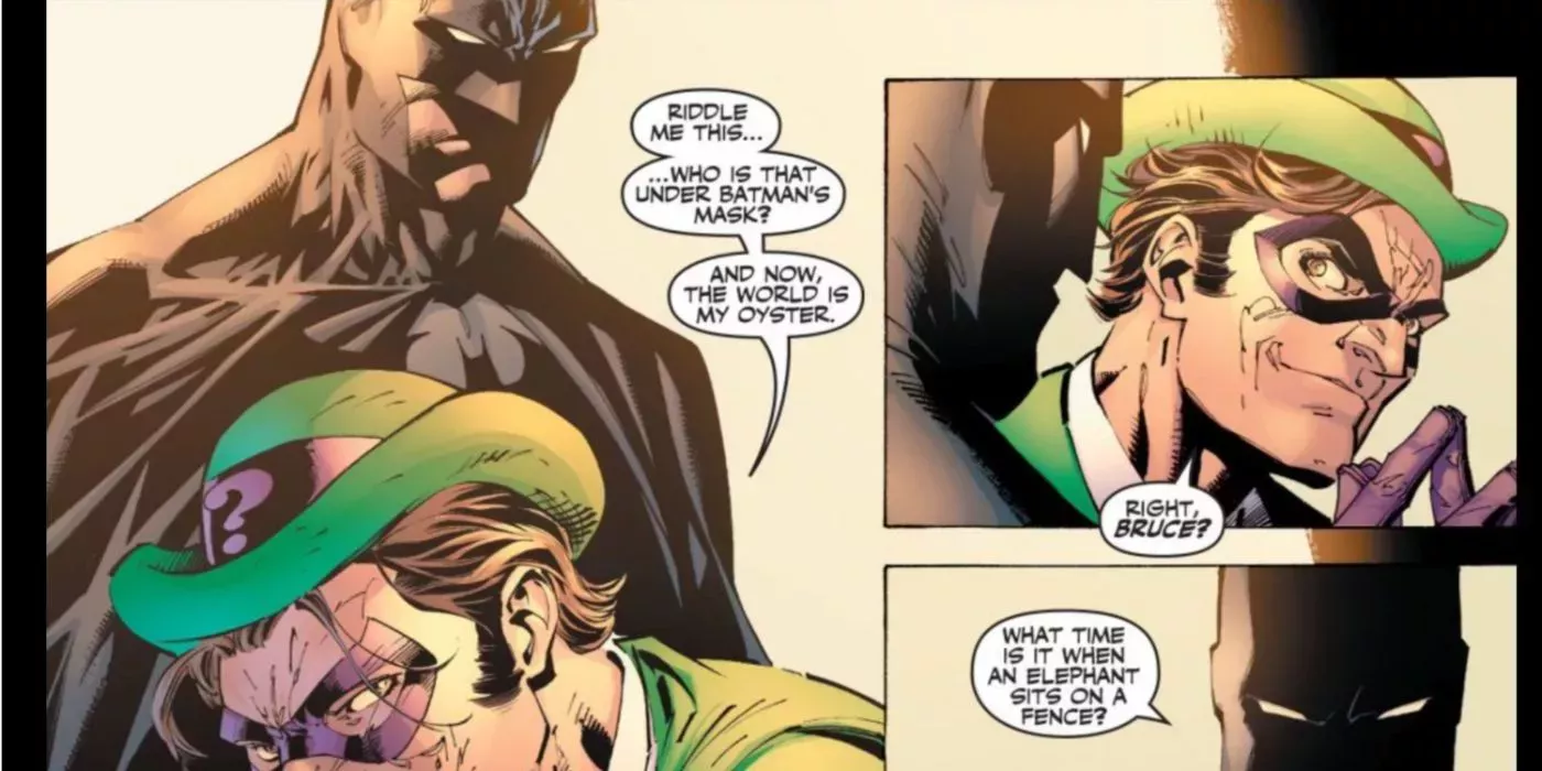 Riddler no es ni mucho menos el primer villano que deduce que Bruce Wayne es Batman, pero aun así resulta satisfactorio verle darse cuenta. Después de todo, el villano que encarna misterios y enigmas debería haber sido uno de los primeros personajes en darse cuenta de quién era su propio archienemigo.