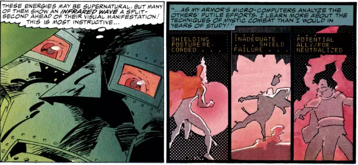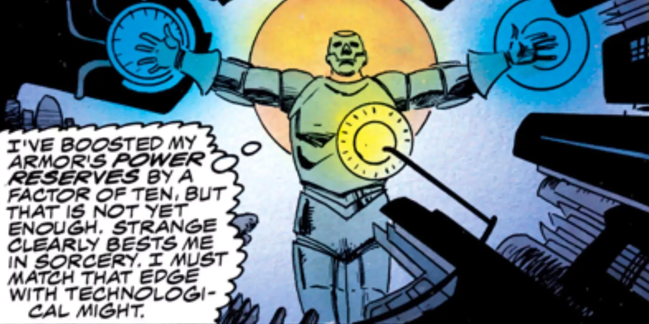 El Doctor Doom parece un villano puramente tecnológico debido a su diseño frío e inhumano, una armadura diseñada por el infinitamente talentoso Jack Kirby- y aunque es extremadamente competente en ciencias y tecnología moderna, la capa exterior que Doom lleva sobre su armadura, una túnica y una capa, indica algo más bajo la superficie. Esto es cierto, ya que Triunfo y Tormento hizo hincapié en cómo Doom era también un maestro de la magia. A lo largo de la historia, el villano pudo equilibrar fácilmente todas sus habilidades en estos campos, lo que le cimentó en una liga propia.