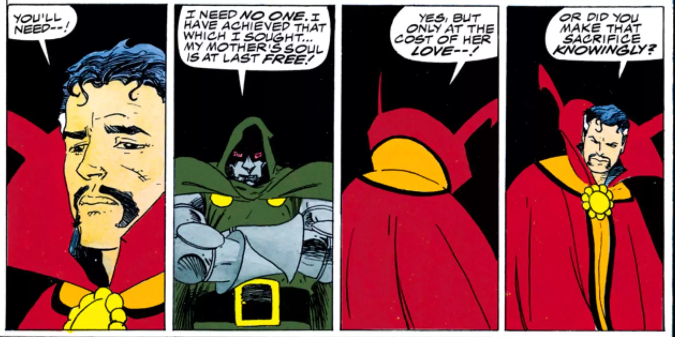 En Triumph and Torment , que narraba el intento de Victor Von Doom de rescatar a su madre de las garras de Mefisto en el Infierno, el villano formaba equipo con el Doctor Strange, recién nombrado Hechicero Supremo. El cómic era asombroso en muchos sentidos y podría decirse que es una de las mejores historias del Doctor Doom por muchas razones, desde mostrar su amistad con el Doctor Strange hasta su dominio de la ciencia y la magia, su amor por su madre y mucho más.