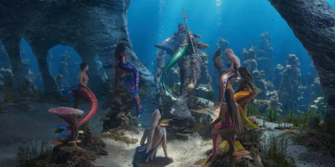 La película de animación original muestra el reino del rey Tritón en todo su esplendor, incluido su glorioso palacio y las aldeas de Merfolk que lo rodean. Sin embargo, el remake de acción real de La Sirenita reduce drásticamente el reino de Tritón y sólo muestra al rey sentado en el fondo del océano en un trono de coral.