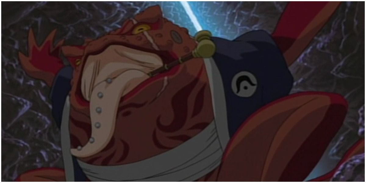 Siguiendo con su idea de obligar a Naruto a usar el chakra de las Nueve Colas, Jiraiya empujó a Naruto por un acantilado, diciéndole que tendría que generar el chakra de las Nueve Colas o morir. Mientras Naruto comenzaba a caer hacia su muerte, pudo utilizar el chakra de las Nueve Colas e invocar a Gamabunta. Gamabunta era el jefe de los sapos y no quería aceptar a Naruto como su amo ya que era sólo un niño. Después de pasar el día torturando a Naruto y tratando de que se cayera de su espalda, Gamabunta finalmente admitió que era consciente de que Naruto fue quien lo convocó por su cuenta. Luego declaró que era la primera vez desde el Cuarto Hokage que alguien se subía a su cabeza.