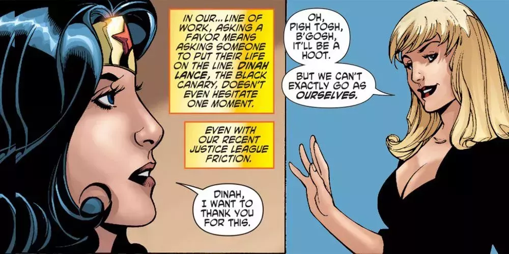La base más obvia para esta relación proviene del Wonder Woman #34 de Gail Simone, Aaron Lopresti, Matt Ryan, Brad Anderson y Travis Lanham. Wonder Woman acude a Canario Negro en busca de ayuda en una operación de lucha clandestina. La Mujer Maravilla piensa en la suerte que tiene de contar con una amiga como Canario Negro. Un número posterior muestra que la foto de Canario Negro está en el apartamento de Wonder Woman, junto con fotos de otras heroínas.