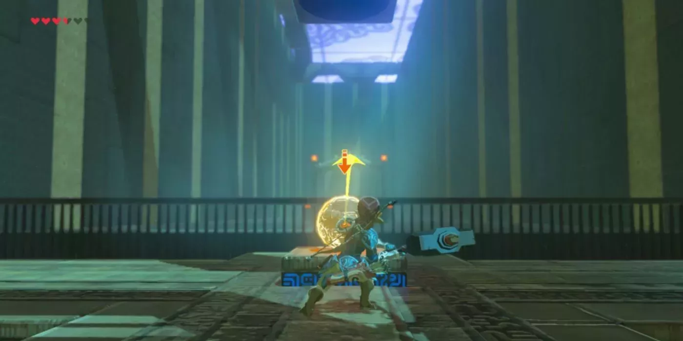 Este es sencillo en la práctica, pero mucho más difícil en la ejecución. Una esfera se asienta sobre un pedestal y Link tiene que usar la Runa de Estasis en la esfera, golpeándola con el Mazo de Hierro con la potencia suficiente para que aterrice en una plataforma en medio de una plataforma que se encuentra detrás de una valla en un cuerpo de agua a una buena distancia.