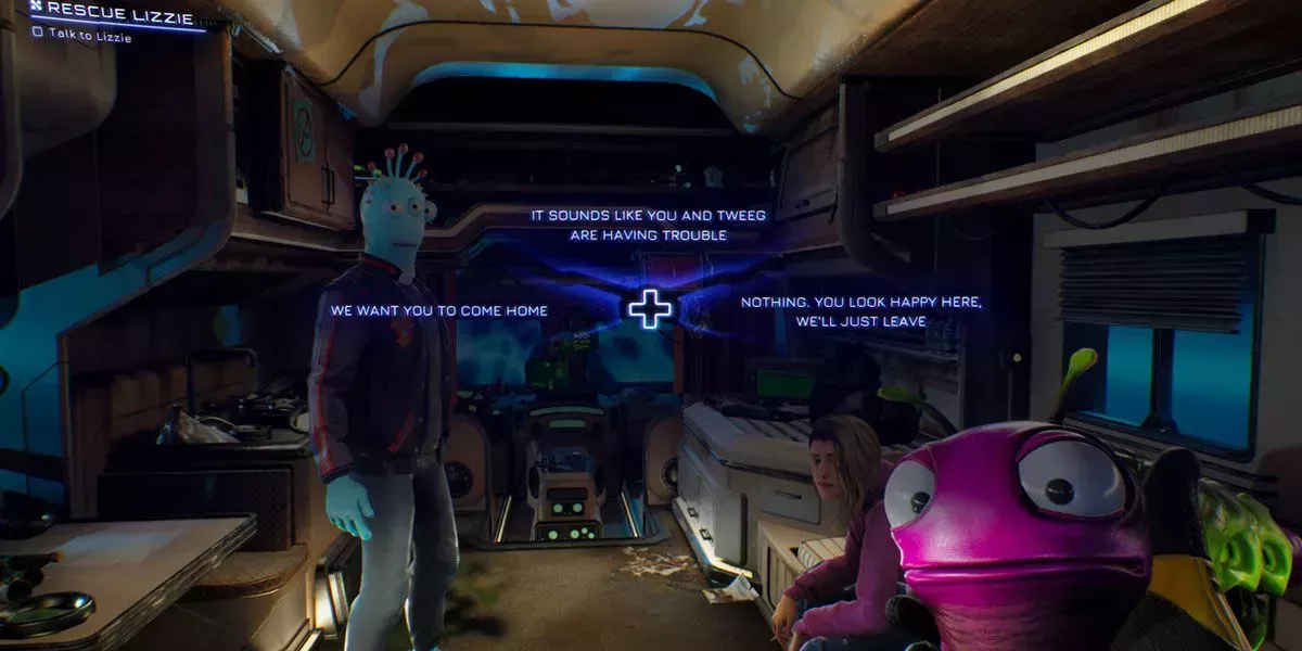 Después de que el jugador se convierta en cazarrecompensas, Lizzie entabla una relación con Tweeg. Tras perder casi todo lo que amaba y ver cómo su hermano se iba de aventuras, tenía sentido que se sintiera lo bastante sola como para buscar el amor. Creyó encontrarlo en Tweeg, un chico alienígena al que Gene desaprobaba. Si el jugador apoya la relación de Lizzie, ella intenta huir con él. Cuando el jugador los persigue, tiene que escuchar cómo Lizzie y Tweeg tienen una charla sincera.