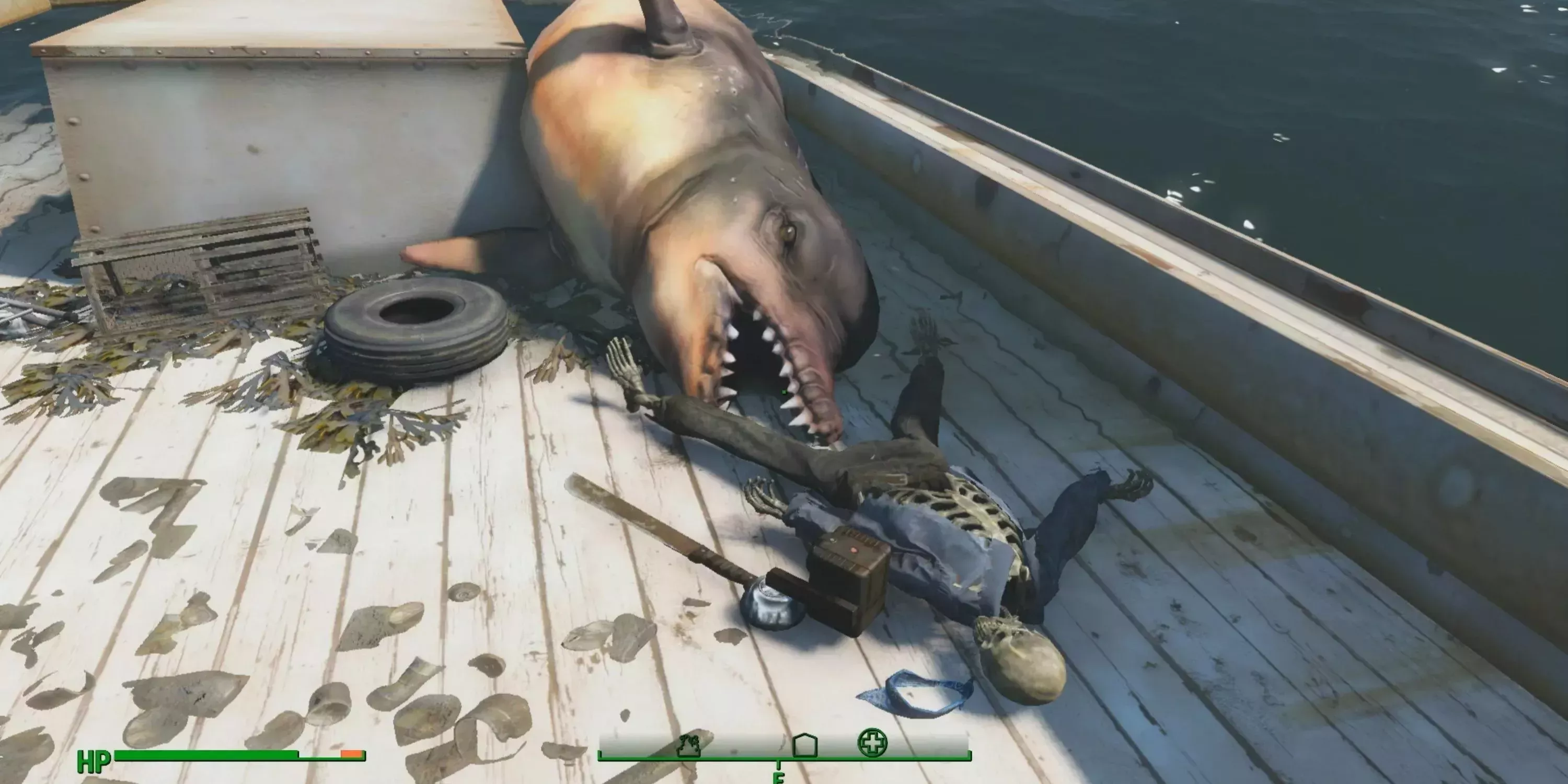 A las afueras de la estación de Oberland hay un naufragio, y dentro de un barco cercano, se puede encontrar un esqueleto junto a un delfín mutado. La disposición de sus cadáveres es casi idéntica a la icónica muerte de Quint en la película Tiburón original, lo que lo convierte en uno de los huevos de Pascua más flagrantes de Fallout 4.