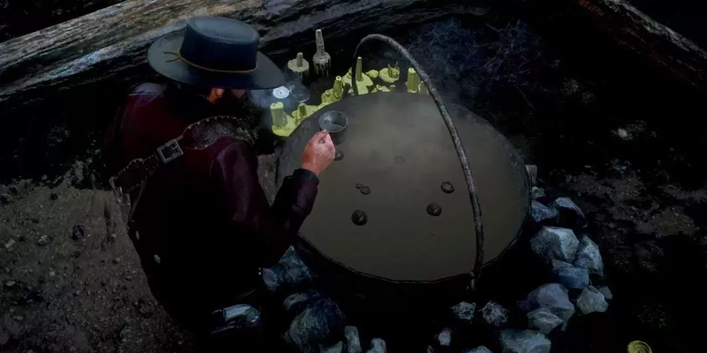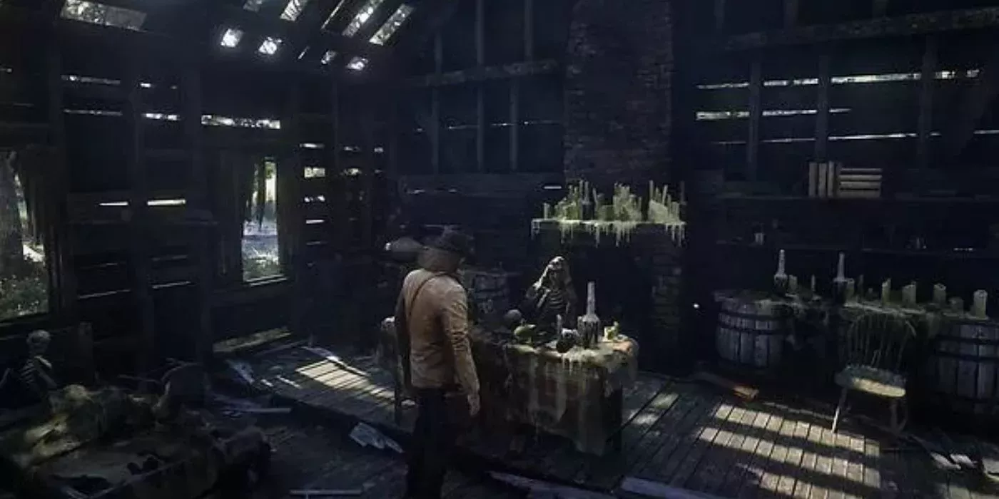 Extraños artefactos rodean el caldero de la bruja en Red Dead Redemption 2. Elementos como cuernos de animales y una mesa llena de lo que parecen ser ingredientes de pociones advierten al jugador de que se aleje del lugar. Pero si Arthur Morgan bebe un sorbo del brebaje del caldero, se desplomará y despertará más lejos de donde empezó. Es un ritmo narrativo increíblemente extraño.