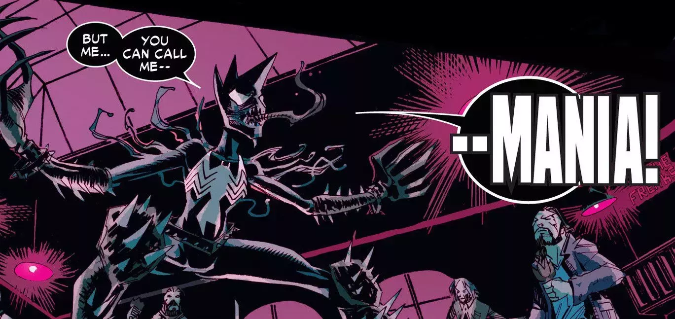 Mania comienza su vida como un clon de Venom que acaba consumido por CarnagePrimera aparición: Venom #1 (Como Venom); Venom (Vol. 2) #38 (Como Mania)