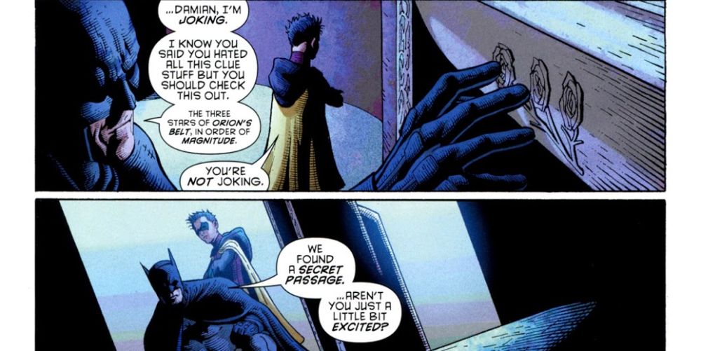 Bruce Wayne puede ser conocido como el mejor detective del mundo, pero ¿alguna vez se emociona cuando descubre una pista? Lo más probable es que no. No es realmente una marca para que Batman se emocione con las cosas. Dick Grayson como Batman, sin embargo, esa es otra historia. Cuando todo el mundo aceptó la teoría de Tim Drake de que Bruce estaba perdido en el tiempo, Alfred, Dick y Damian buscaron pistas en toda la Mansión Wayne. Puede que a Damian no le importe el trabajo de detective, pero a Dick le encanta encontrar un pasadizo secreto.