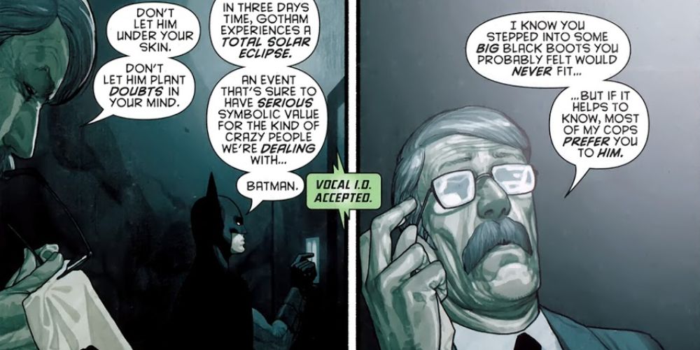 En lo que esencialmente equivale a una línea de descarte en Batman y Robin #13 del escritor Grant Morrison y el artista Frazer Irivng, el Comisionado Jim Gordon está hablando con Batman sobre la opinión de la policía sobre él. Aparentemente, la policía de Ciudad Gótica prefiere este nuevo Batman al viejo, pero como no se ha elaborado más, no hay una razón clara para ello. Dick hace todo lo que Bruce hizo cuando era Batman, así que la respuesta debe ser la diferencia de personalidades.