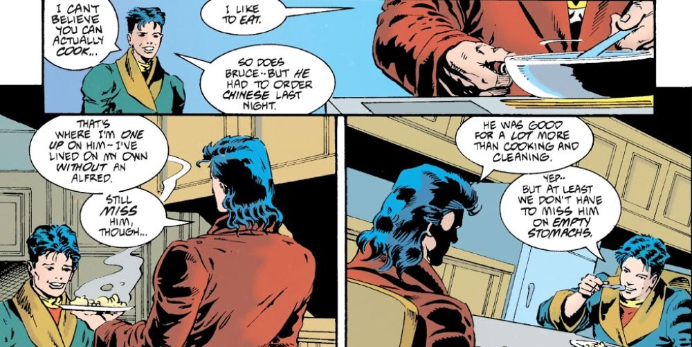Mientras Bruce se fue a cavar túneles bajo Ciudad Gótica, Dick se unió a su nuevo compañero, Tim Drake, mientras les cocinaba algo de comida. En este punto de los comics, Alfred había dejado la familia Bat por un tiempo, y por lo tanto no había mayordomo en la casa cuando Dick y Tim comenzaron a luchar contra el crimen juntos como Batman y Robin. Según Tim, Bruce acababa de pedir comida china la noche anterior, que apenas es nutritiva para dos luchadores contra el crimen.