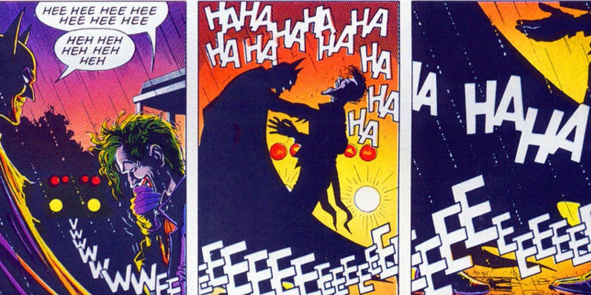 Cuando Batman y El Joker se ríen juntos bajo la lluvia, uno de ellos asesina al otro cuando las luces se apagan. Aunque en la obra gráfica, Batman se acerca a El Joker, esta última mano también se acerca hacia adelante. Nadie sabe lo que pasa después, excepto que la risa se corta en dos paneles y las luces se apagan.