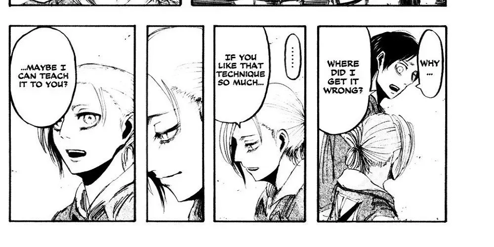 Se burló de su actuación, haciendo que Eren le preguntara en qué se había equivocado. Ella sonríe por primera vez, e incluso se ofrece a enseñarle directamente, a pesar de ser alguien que prefiere mantenerse alejado de los demás.