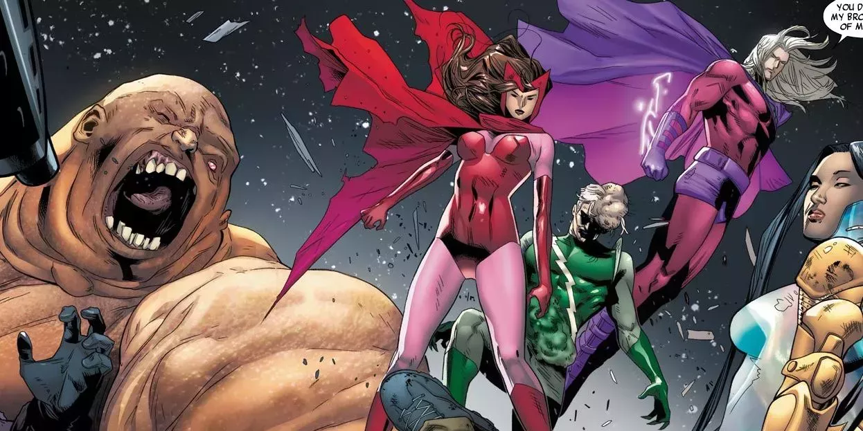 Bruja Escarlata se alió con Magneto, el hombre que creía que era su padre, y atacaron al equipo. Todo esto es un ejemplo más de que los problemas personales de Bruja Escarlata la afectan y la convierten en un enemigo peligroso para los que eran sus amigos.