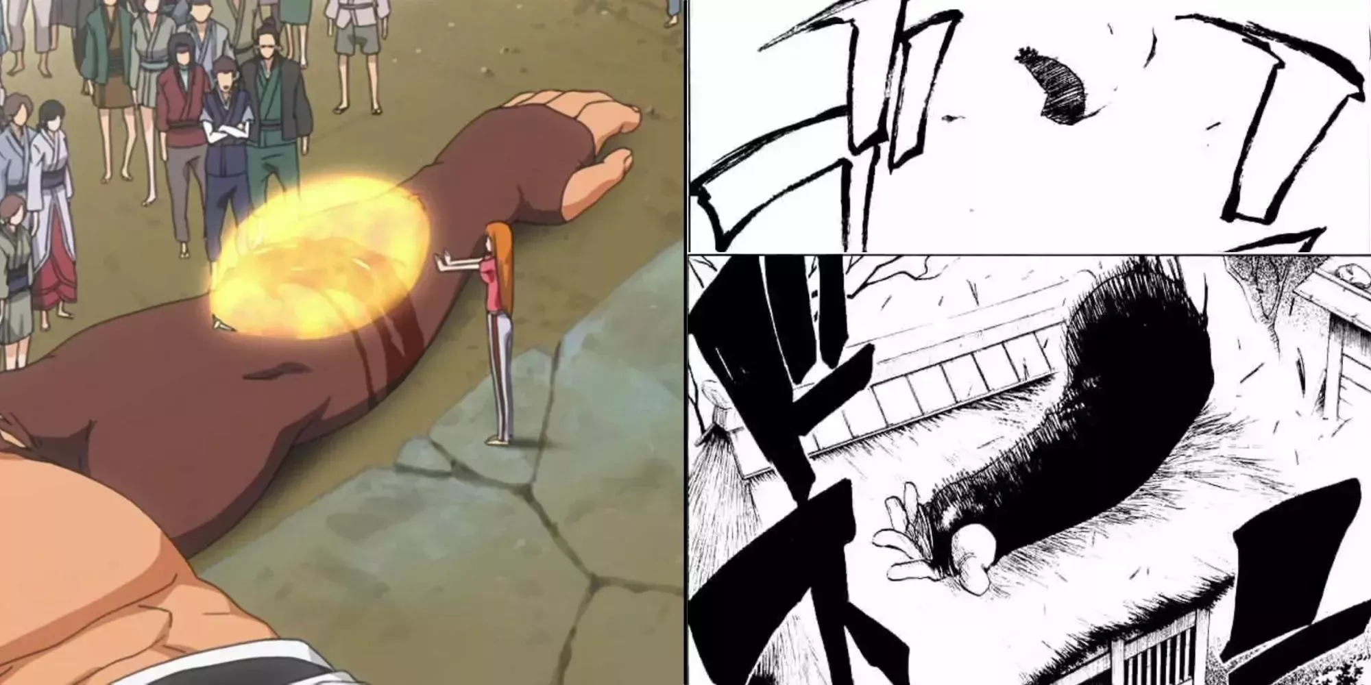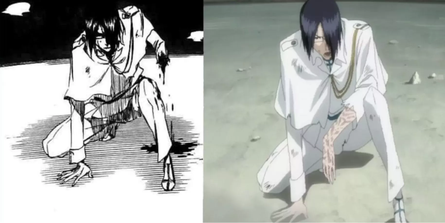 Mientras que en el anime está gravemente herido, en el manga el alcance de los daños es mucho peor, ya que le faltan tres manos y tiene que sujetar fÃsicamente su cuerpo por el hombro para poder mantenerse en pie. Cuando Zaraki le golpea de nuevo un momento después, pierde otras dos manos.