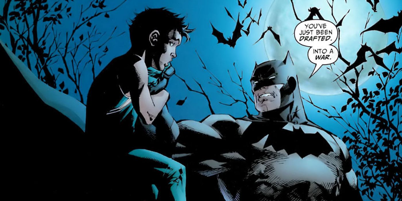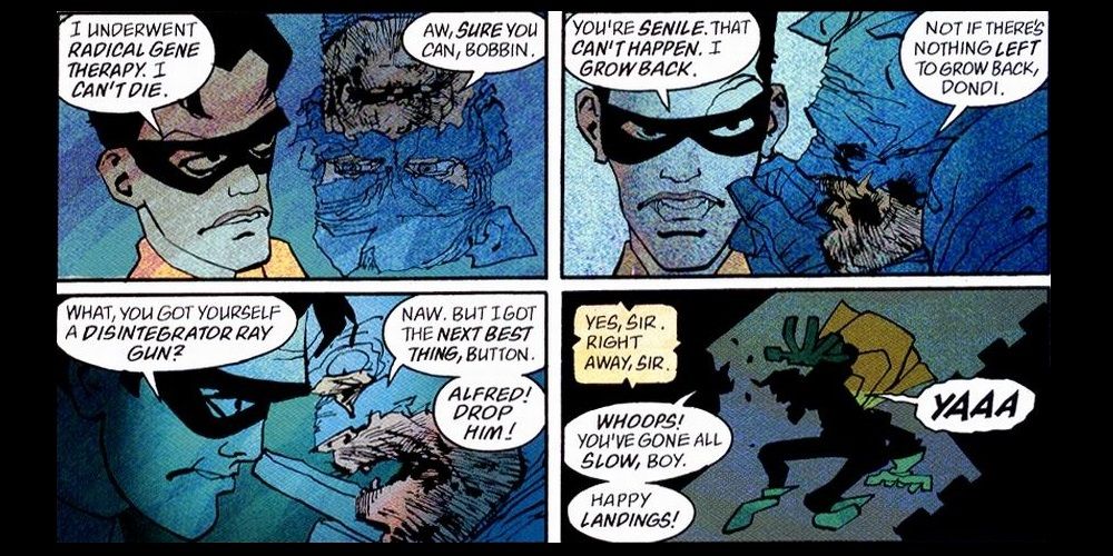 Cuando Dick está comprensiblemente conmocionado por esto, abofetea al chico en la cara, reprendiéndolo por ello. Es una escena chocante que hace que Batman parezca un villano digno de ser perseguido.