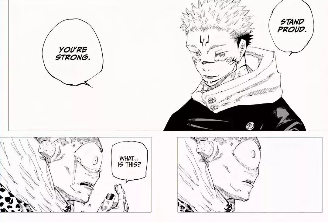 De algún modo, Sukuna se une a los tres en los pensamientos de Jogo y le informa de que es uno de los oponentes más duros a los que se ha enfrentado. Sólo estas palabras demuestran el respeto que Sukuna siente por Jogo, algo que Sukuna rara vez muestra a sus oponentes. La escena entre Sukuna y Jogo concluye con Sukuna diciéndole a Jogo: "Mantente orgulloso. Eres fuerte".