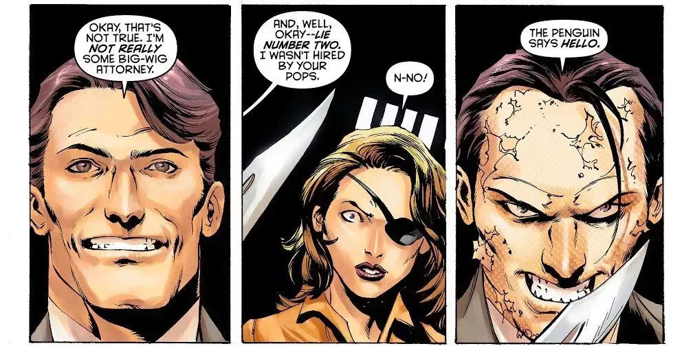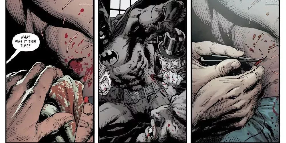 Escrita por Geoff Johns e ilustrada por Jason Fabok, Batman: Three Jokers es una serie limitada que se centra en el mito del Joker. En las primeras páginas de la serie, sin embargo, vemos a Batman tropezando en su camino a la Batcueva después de un encuentro con El Pingüino. Un encuentro que lo dejó mucho peor, lo que llevó a Alfred a coser al pobre Bruce.