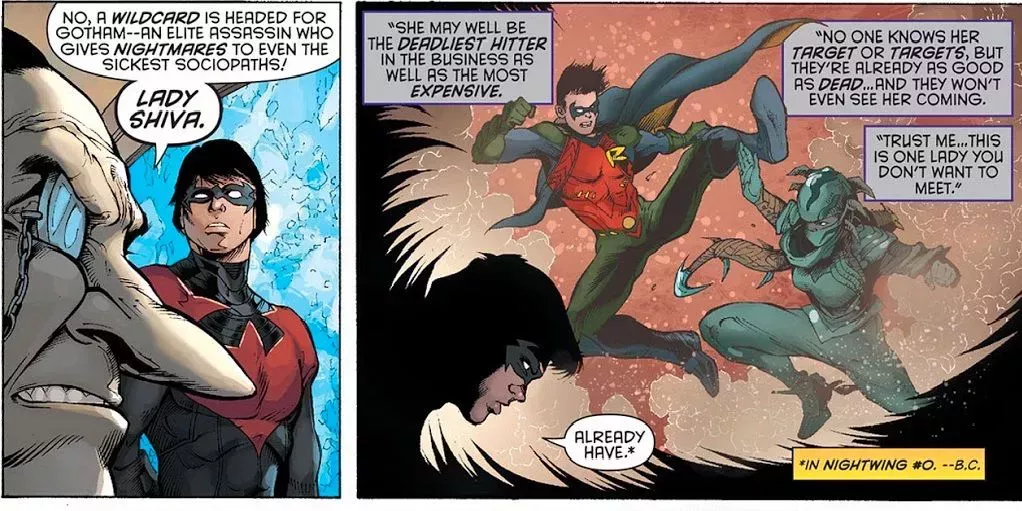 El Pingüino informa a Grayson de la llegada de Lady Shiva a la ciudad y de que su aparición sólo puede significar que está asesinando a alguien en Gotham. Pero resulta que la persona que está detrás de su contrato es el propio Pingüino. Aprovechó que Batman estaba ocupado con el Joker para contratar a Lady Shiva para que se encargara de algunos molestos funcionarios del gobierno que se metían en sus asuntos. Esperaba que informar de su presencia a Grayson resolvería su problema de pagar la factura de Lady Shiva después de que ella terminara.