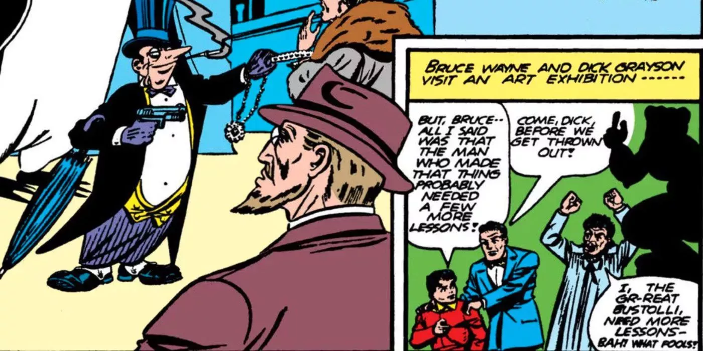 Cuando Batman va tras el Pingüino, el murciélago es drogado por uno de los paraguas trucados del Pingüino. Peor aún, Cobblepot incrimina a Batman y hace que lo arresten los mejores de Gotham. La historia es un poco tonta, pero marcaría el tono de este icónico villano durante décadas.