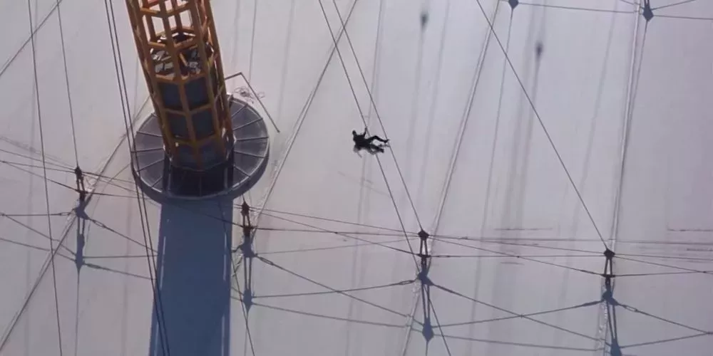 Después de esta caída en El mundo no es suficiente, Bond es capaz de agarrarse a una cuerda para no caer. Pone todo el peso de su cuerpo sobre un brazo que debería estar roto por varios sitios, si no unido a un hombre muerto por completo.