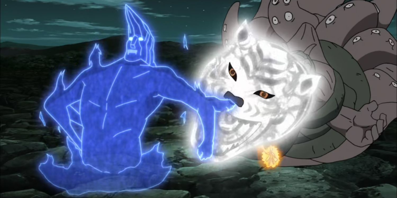 Durante la Cuarta Guerra Shinobi, Madara sujetó al Ocho Colas con el jutsu de estilo madera de Hashirama, y utilizando su espada de Susanoo, lo habría apuñalado de no ser por Naruto en su forma de Kurama Chakra, que intervino y detuvo la espada en el aire.