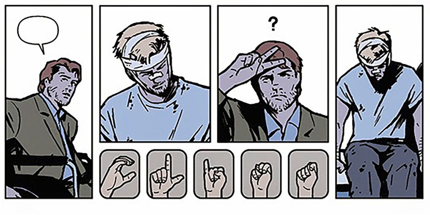 La lista de lesiones que sufre cuando se golpea contra el techo de un coche es impresionante y a lo largo de su carrera, Fraction no rehúye el efecto que la posición de Clint en la vida tiene en su bienestar físico. Con costillas rotas, una pelvis rota y un esguince de cuello por sus problemas en estas primeras páginas, se pone de manifiesto que a lo largo de las peleas durante sus años con los Vengadores, ésta no era ni mucho menos la primera vez que estaba tan golpeado.