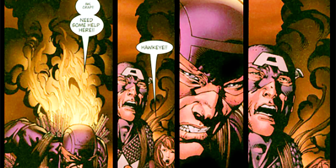 Mientras los Vengadores luchaban contra copias de sí mismos para salvar a algunos agentes de SHIELD, la lucha se volvió un poco explosiva. Sin embargo, en esa explosión, Clint quedó atrapado en un derrumbe cuando iba a respaldar al Capitán América. Quedó atrapado y se rompió la pierna.