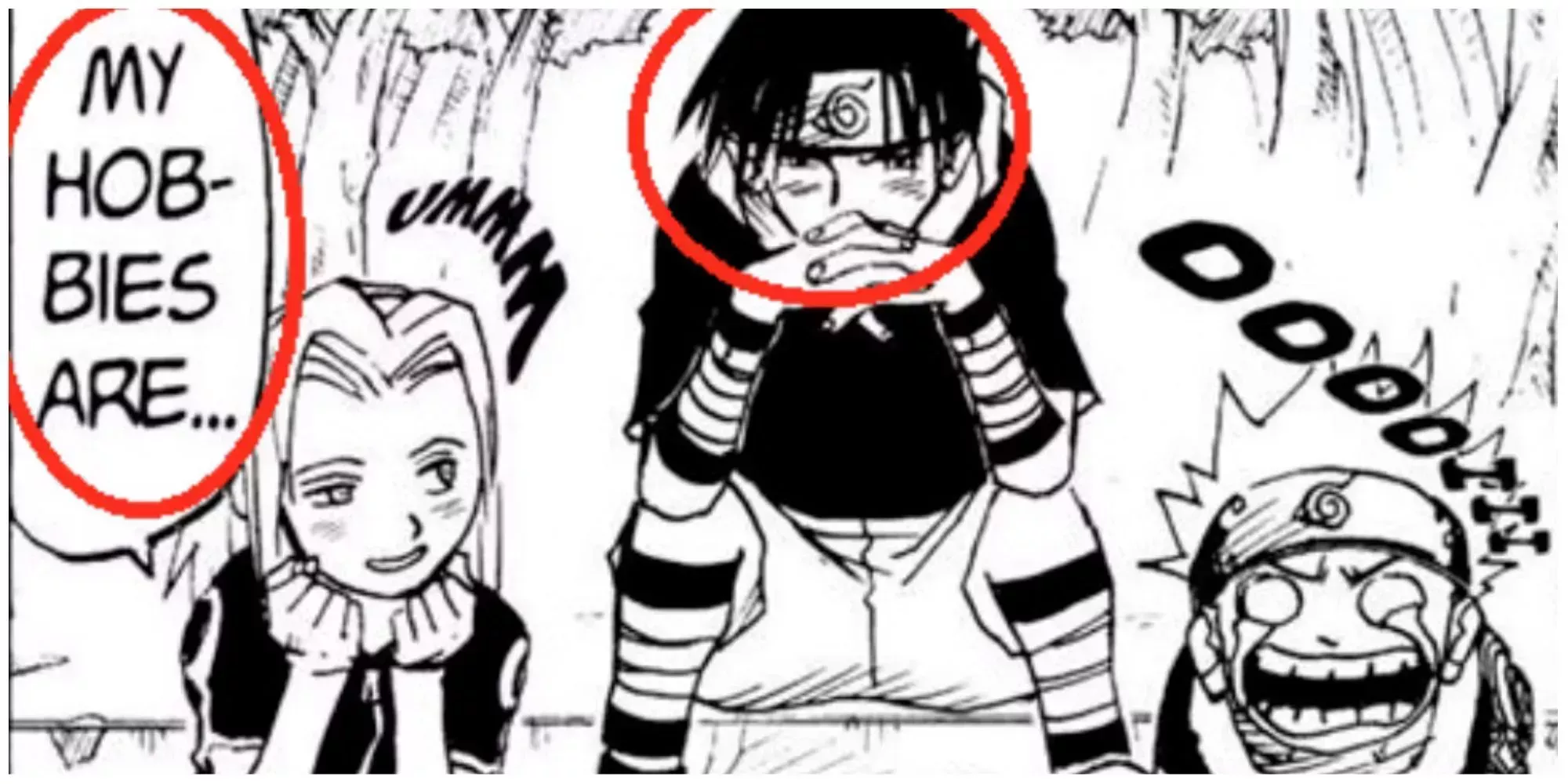 Aunque el anime de Naruto le resta importancia, el manga muestra la vergüenza de Sasuke cuando el Equipo 7 se presentó a Kakashi. Más exactamente, cuando Sakura se presentó a Kakashi.