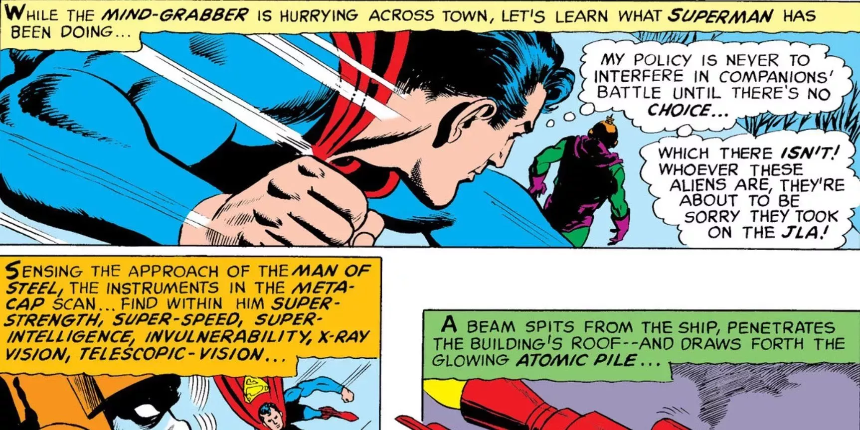 Superman ha admitido no interferir a menos que sea necesario. En Justice League of America #70, los alienígenas fueron capaces de tomar los poderes de algunos miembros de la Liga de la Justicia y derrotarlos. Cuando lo intentaron con Superman, sus poderes sobrecargaron sus dispositivos porque tiene muchos de ellos.