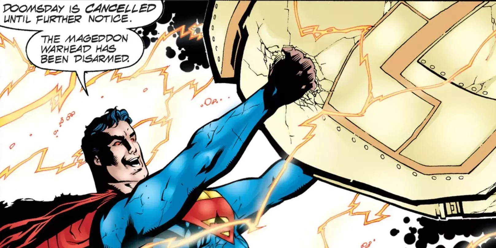 Mientras el mundo perdía la esperanza, Martian Manhunter y Batman establecieron contacto telepático con Superman. Con sus palabras de ánimo, Superman se liberó de las ataduras de Mageddon. Entonces, usando su habilidad para drenar la energía solar, Superman absorbió la luz antisolar de Mageddon, voló hacia su centro y le arrancó la ojiva.