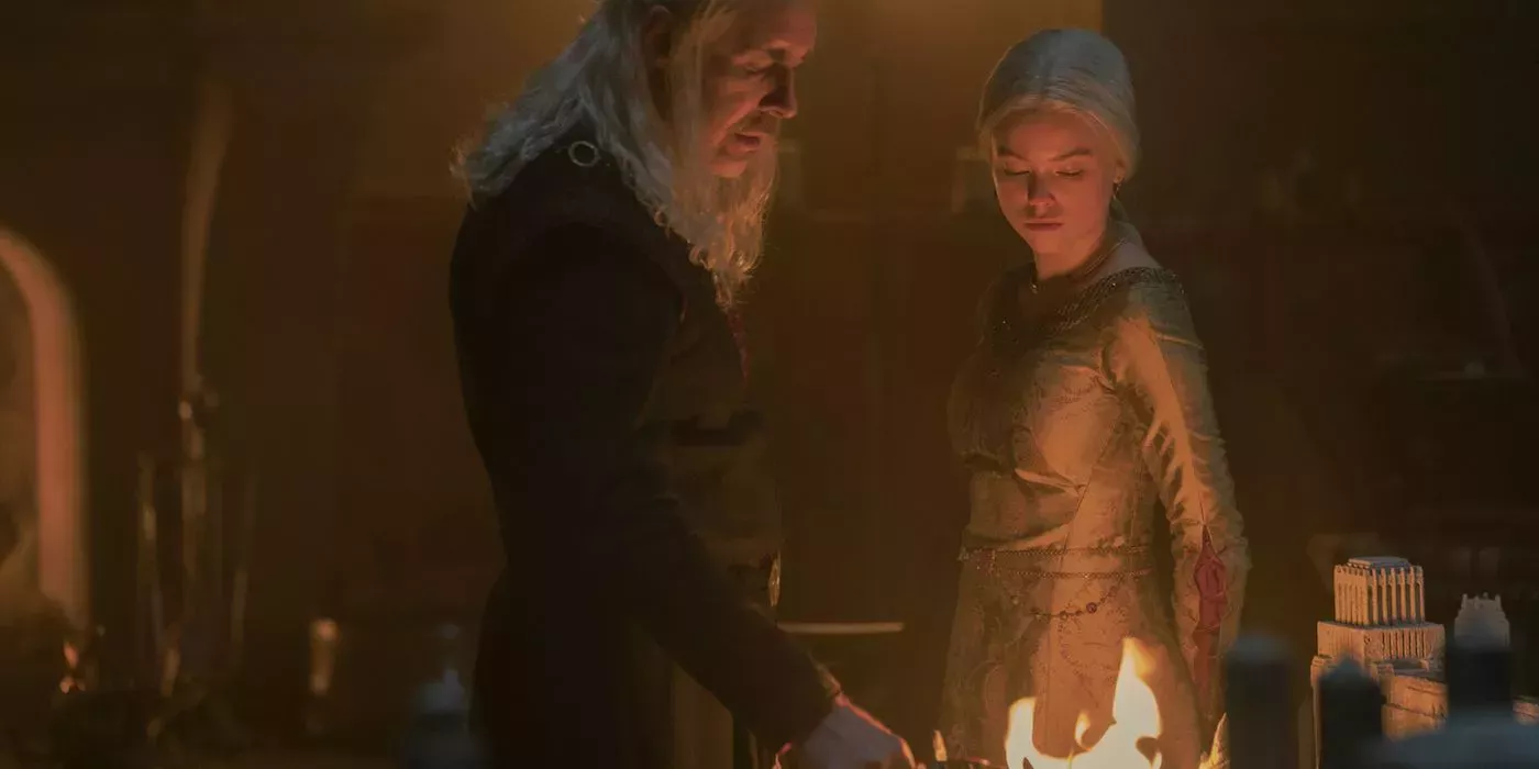 Aunque Viserys retiene a Rhaenyra como su legítima heredera, hace un sólido comentario sobre su estado civil. Cuando Rhaenyra se niega obstinadamente a casarse por un deseo de libertad, Viserys respalda su propia postura diciendo que ni siquiera él pudo escapar de esta tradición mediante su nuevo matrimonio con Alicent.