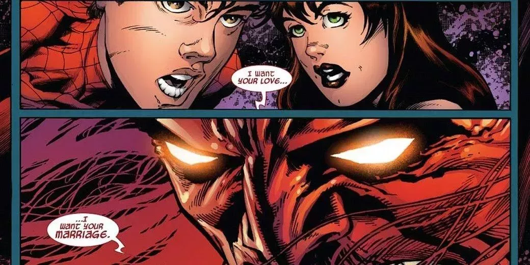 Aunque el borrado de un matrimonio tan bueno como el de Mary-Jane y Peter es una tragedia, nos consuela saber que Mephisto aceptará matrimonios como pago por salvar la vida de un ser querido. La razón por la que Mephisto acepta matrimonios como moneda de cambio es un misterio, pero parece que siempre es una opción si alguien está al borde de la muerte.
