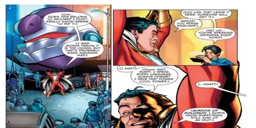 Una de las habilidades más oscuras de Shazam es el poder de la omnilingüÃstica. Al canalizar la sabidurÃa de Salomón, Shazam es capaz de entender y hablar cualquier idioma de la Tierra. Mientras que los mayores villanos de Shazam sólo entienden el lenguaje de la violencia, el lujo de conectar con otros sin barreras lingüÃsticas es una gran ventaja para el héroe.