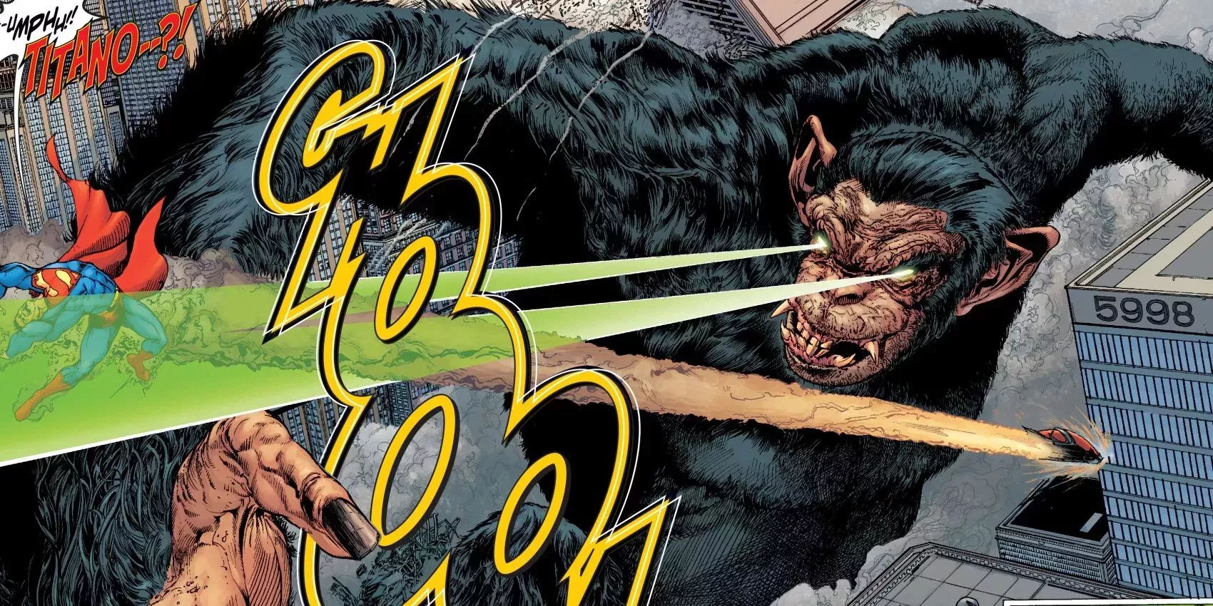 Titano es un chimpancé gigante que ha luchado contra Superman muchas veces a lo largo de los años. Es un monstruo del tamaño de un kaiju, con toda la fuerza que eso implica, y tiene la agilidad de un chimpancé. Con su tamaño, puede causar grandes cantidades de daño. Además, puede disparar ráfagas de radiación de kriptonita, lo que le ha convertido en un enemigo especialmente peligroso para Superman.