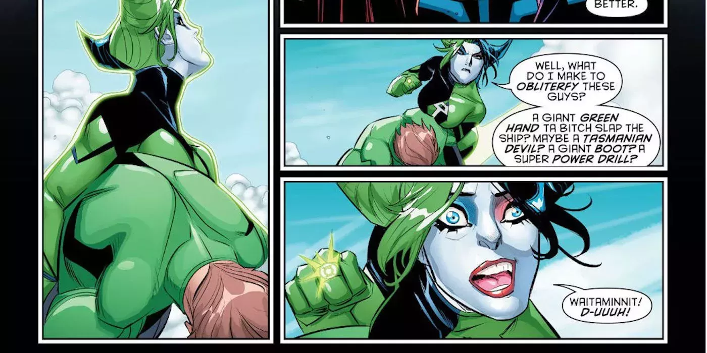 Sorprendentemente, Harley Quinn usó un anillo de poder de Linterna Verde durante su miniserie Little Black Book, en la que formó equipo con héroes de DC como Power Girl y Hal Jordan. Harley utiliza el anillo de poder de Hal mientras está inconsciente para derrotar a unos alienígenas invasores que buscan un anillo aún más poderoso. Harley era sorprendentemente serena y hábil con el anillo, creando construcciones de energía como un mazo verde gigante.