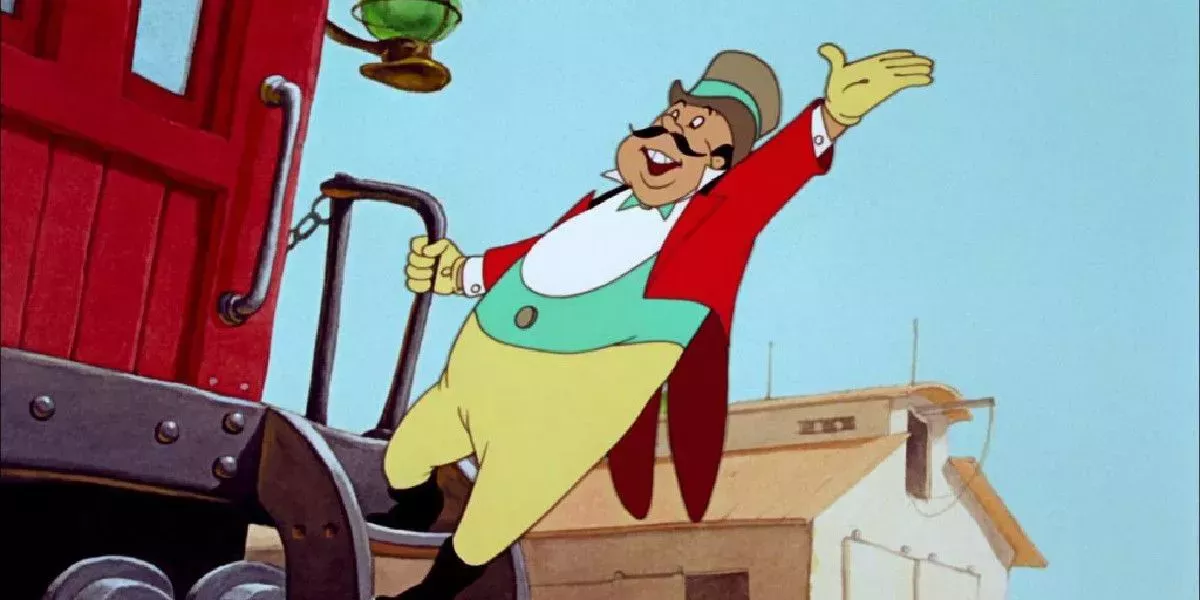 El maestro de ceremonias ni siquiera intentó capturar o detener a Dumbo. En su lugar, huyó, cayendo de cabeza en un cubo de agua y perdiendo su circo y su tren a manos del paquidermo volador.