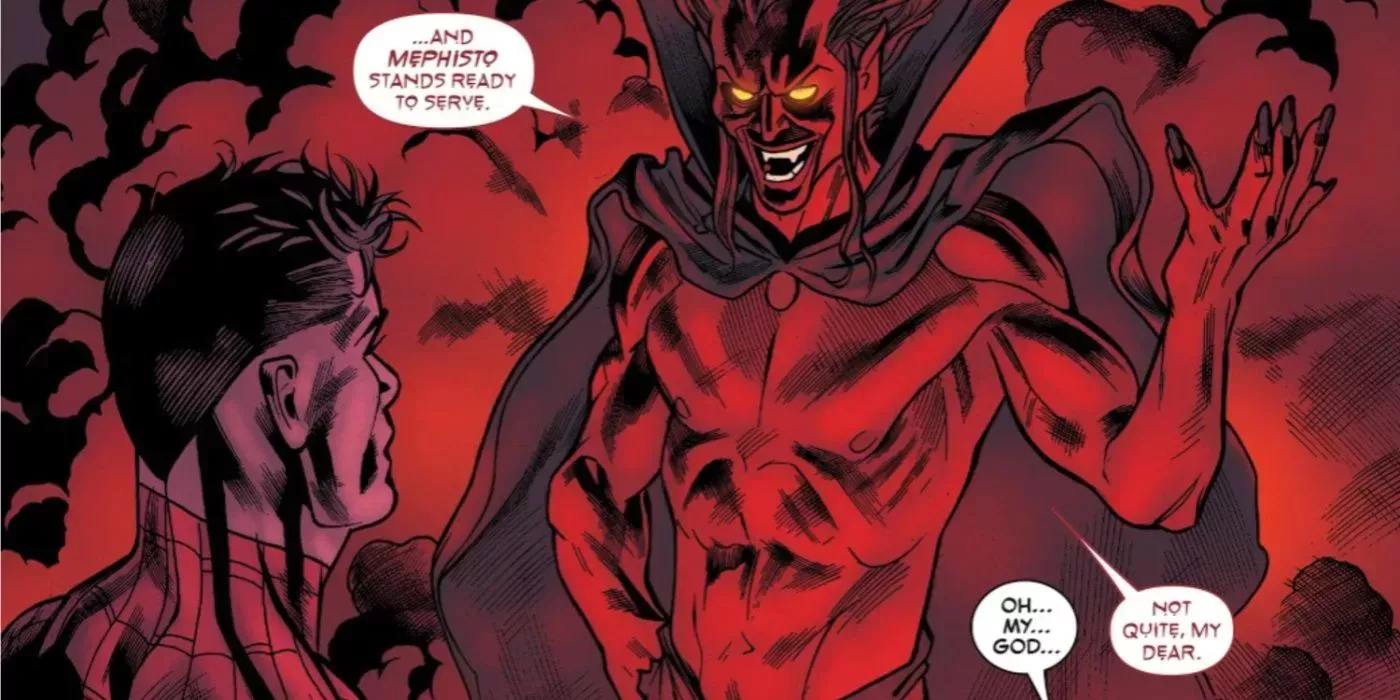 Basado en el demonio Mefistófeles, este diabólico negociador hizo que Spiderman vendiera su matrimonio con Mary Jane para salvar a su tía May, proteger su identidad secreta y abrir oportunidades argumentales para los guionistas. Aunque no es realmente el Diablo, Mefisto está demasiado cerca, con una dimensión infernal y terroríficos demonios a su servicio. Además de las implicaciones y los temas teológicos, sus habilidades para alterar la realidad ya han dado problemas en el pasado, creando agujeros argumentales tan grandes como para pilotar un helitransporte de S.H.I.E.L.D., como se vio en la infame historia de "Un día más". Introducir a Mefisto supondría pagar un precio muy alto y que el público exigiera reembolsos.