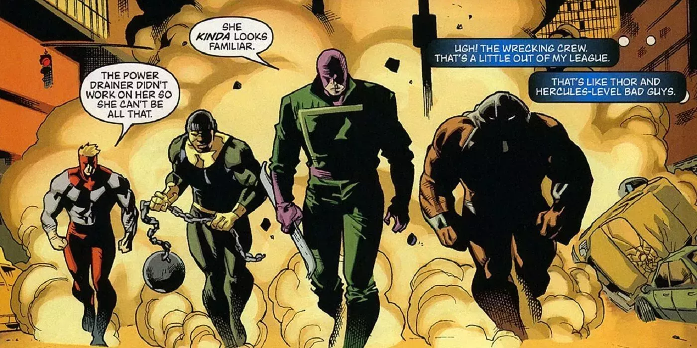 La Wrecking Crew está formada por un ex-laborador, un peón, un sargento mayor del ejército y un físico. Todos ellos adquirieron habilidades sobrehumanas tras agarrar una palanca encantada que fue alcanzada por los rayos. Puede que no se sientan como otros villanos de Thor, pero el Dios del Trueno es uno de sus adversarios más comunes.