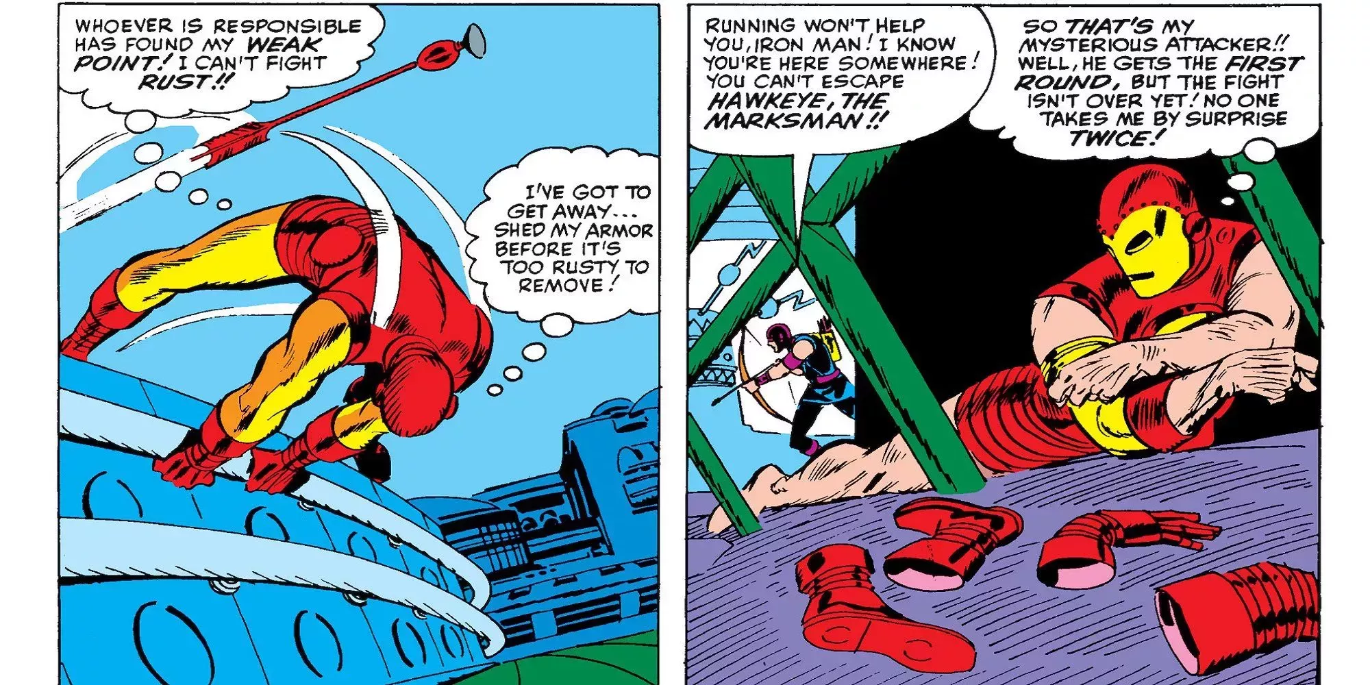 Aunque no era su intención, Ojo de Halcón fue culpado de un robo que lo metió en problemas con la ley. Aun así, estaba más que preparado para Iron Man. Atacó a Shellhead con Flechas de Óxido, lo que provocó que Tony Stark tuviera que detener por completo el combate para ir a buscar otra armadura.