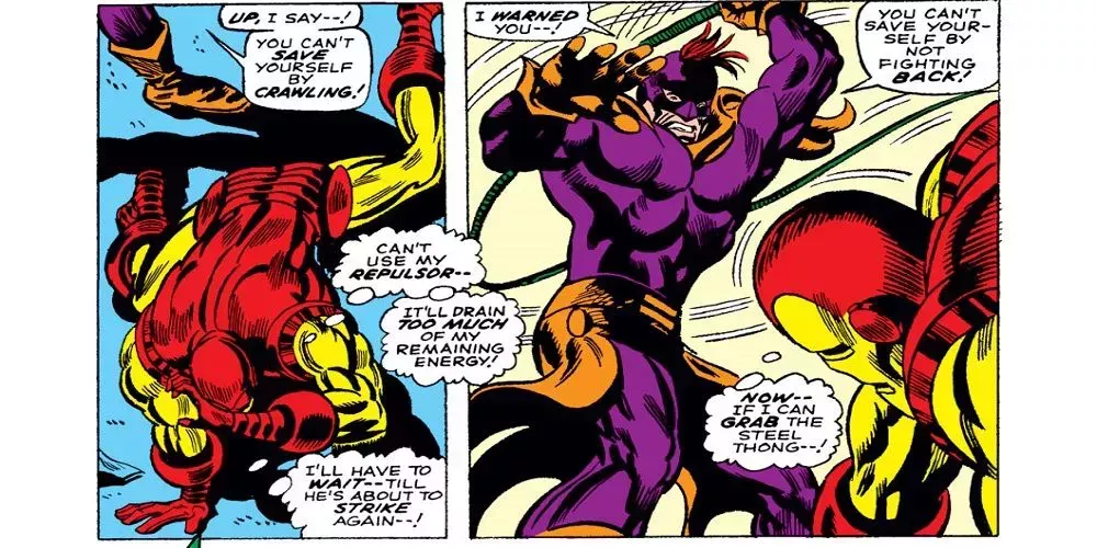 Gracias a que la armadura de Iron Man es débil en potencia, Whiplash es capaz de utilizar su látigo de acero para dejar la armadura de Iron Man hecha jirones. Esto es con Iron Man teniendo superfuerza mientras Whiplash no tenía nada más que su truco.