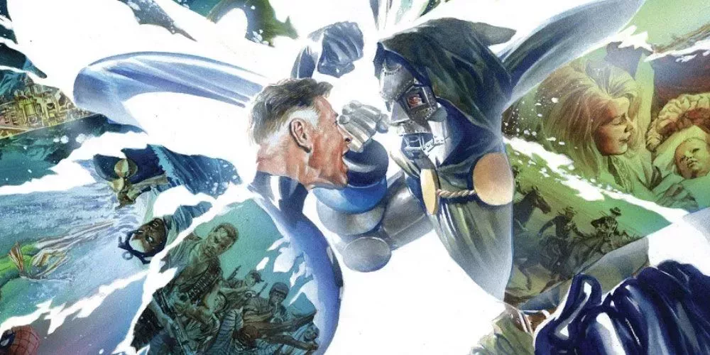En la que posiblemente sea la batalla más épica jamás librada entre Reed Richards y el Doctor Doom, los dos gigantes científicos se enfrentan en igualdad de condiciones, no sólo con sus cuerpos sino con sus palabras. Richards acaba planteando una pregunta a Doom, preguntándole si cree que él (Richards) habría hecho mejor las cosas con el poder de un dios que Doom, y éste admite a regañadientes que sí.