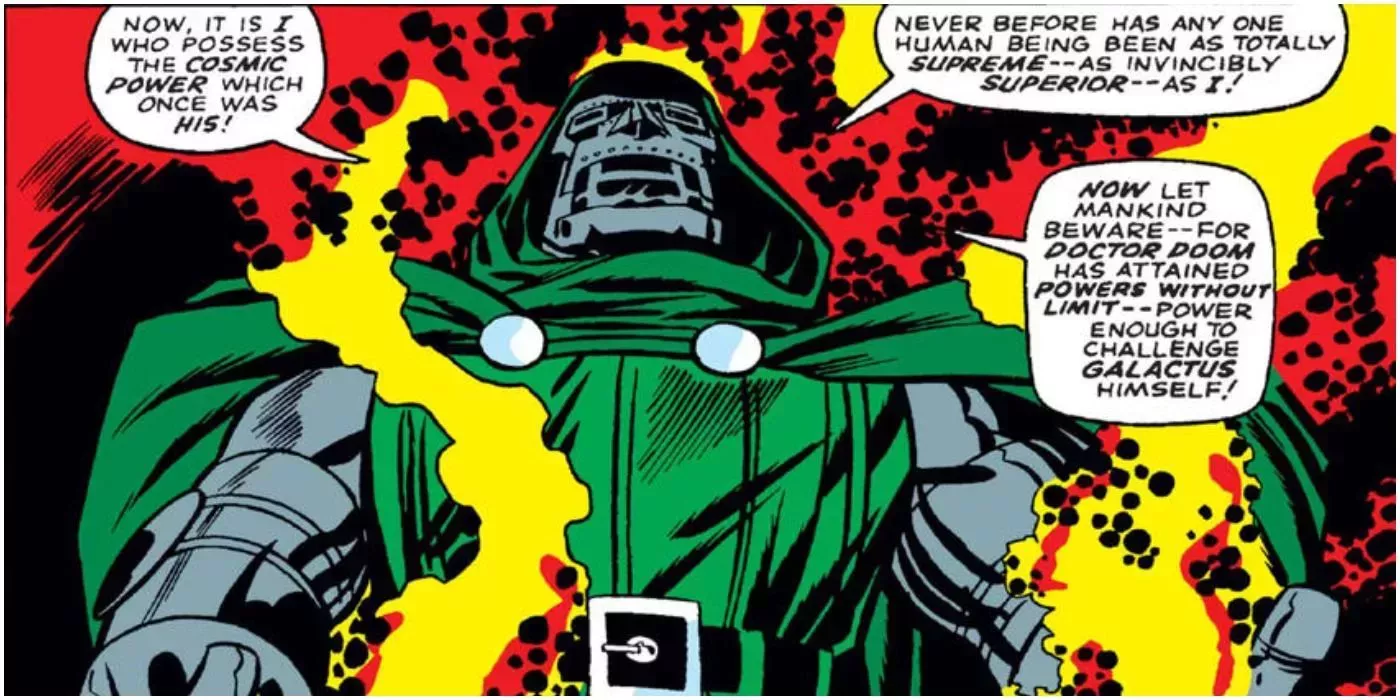 En Fantastic Four #57 , Doom atrae a Silver Surfer a su castillo en Latveria. En la página 15, se dedica un solo panel a representar a Doom mientras drena el Poder Cósmico del antiguo sirviente de Galactus en su propio ser. Las ondas de energía rojinegras crean un excelente contraste de color con la capa verde y la armadura gris de Doom.