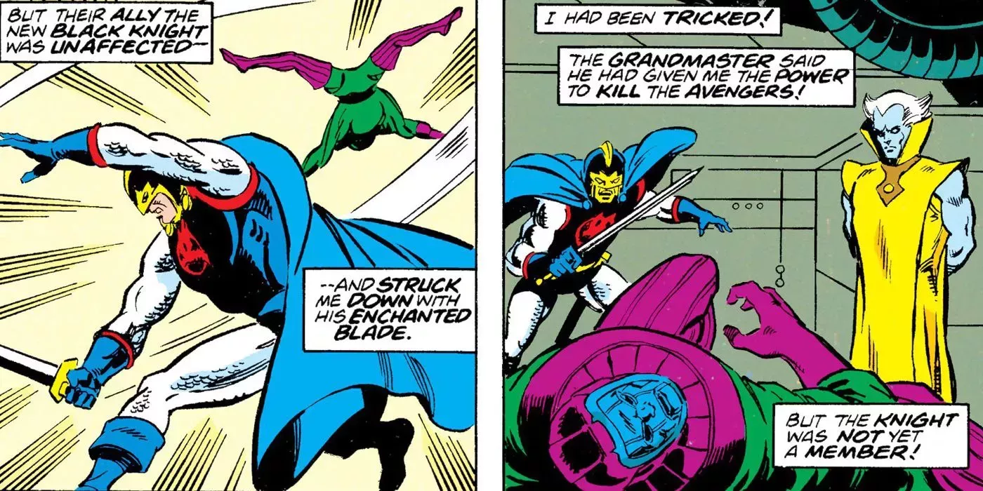 Tras formar equipo con los Vengadores para luchar contra Surtur y otros enemigos, Caballero Negro se topó con Kang y el Gran Maestro en un conflicto épico. Utilizando su espada mágica, la Hoja de Ébano, Caballero Negro derrotó a Kang en un combate en solitario y se ganó su puesto como Vengador.