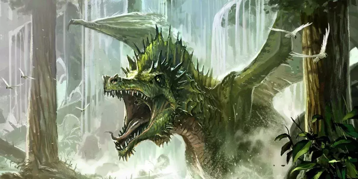Manipuladores y cerebros, el dragón verde valora las redes de información y los esclavos. Expulsan veneno o vapores corrosivos por la boca y viven en bosques profundos. Los dragones verdes son una amenaza persistente para cualquier comunidad de elfos de madera, y su influencia y maquinaciones políticas han minado a muchos aventureros. El alcance de un dragón verde va más allá de su bosque natal, ya que utiliza a sus siervos para sobornar o asesinar a otros.