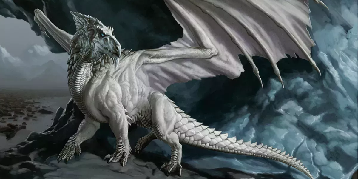 El menos poderoso de los dragones cromáticos, el dragón blanco caza y merodea por las regiones nevadas desatando su aliento gélido sobre los demás. Son los más asilvestrados de los dragones y confían en su instinto más que en su intelecto en casi todas las cosas. Una vez que han conseguido su objetivo de un refugio decente y un estómago lleno, suelen estar satisfechos.