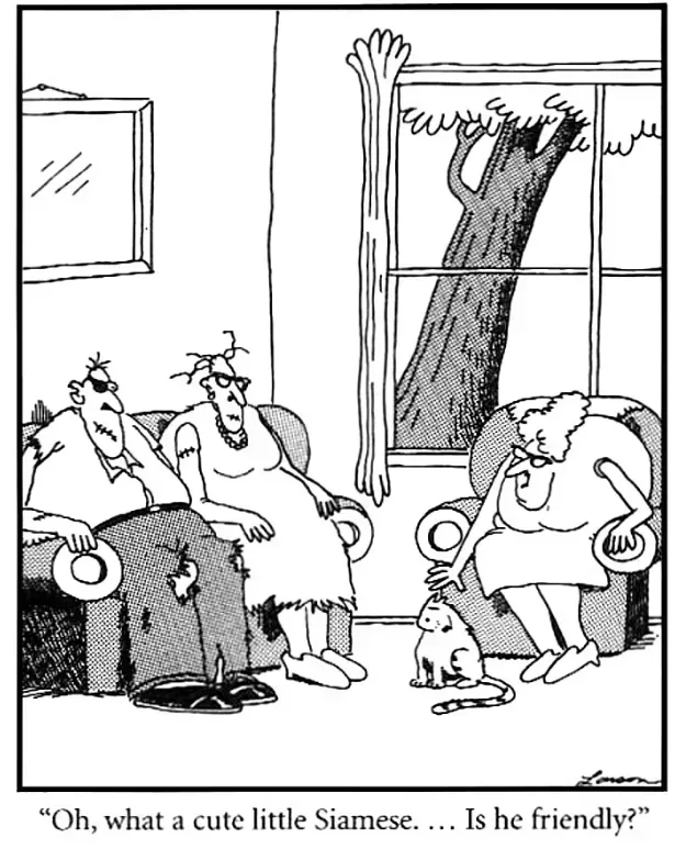 En este cómic de Far Side, Larson retrata a un invitado en casa de una pareja que tiene un gato siamés. El gato se ha colocado cerca del invitado y parece tranquilo y sin pretensiones. Pero la pareja sentada en el sofá es otra historia. Sus ropas están rotas, su pelo casi ha desaparecido y el hombre tiene un parche en un ojo. Cuando la invitada se inclina para acariciar al gato, pregunta: "¿Es simpático?".