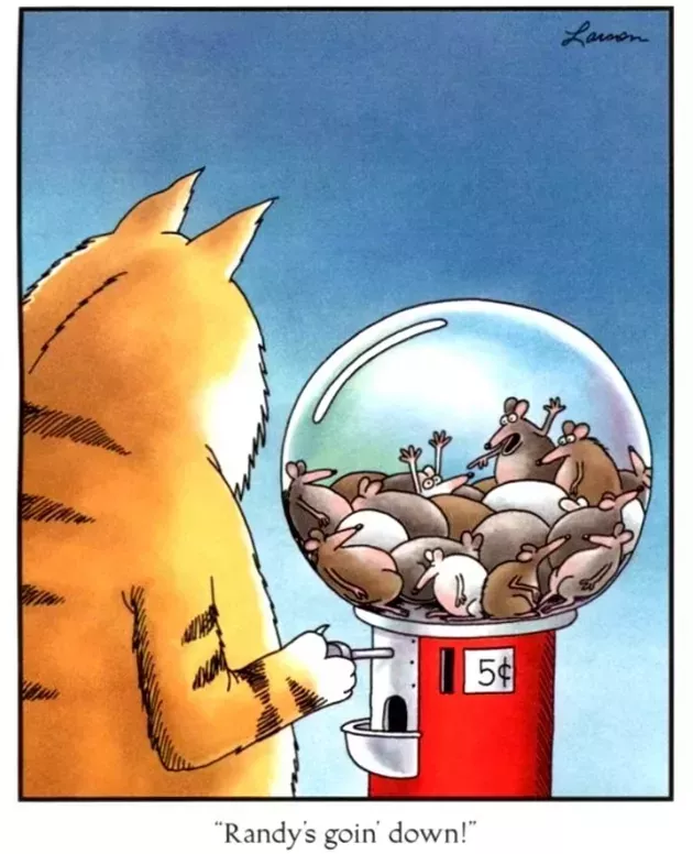 Antes de que Toy Story inmortalizara la máquina de garras llevándose a uno de los extraterrestres a un lugar mejor, este cómic de Far Side estableció el mismo concepto pero con el supuesto contrario. En este cómic, las ratas están cautivas en una máquina de chicles, esperando a que el destino las convierta en la próxima víctima de la necesidad de un gato por un tentempié.